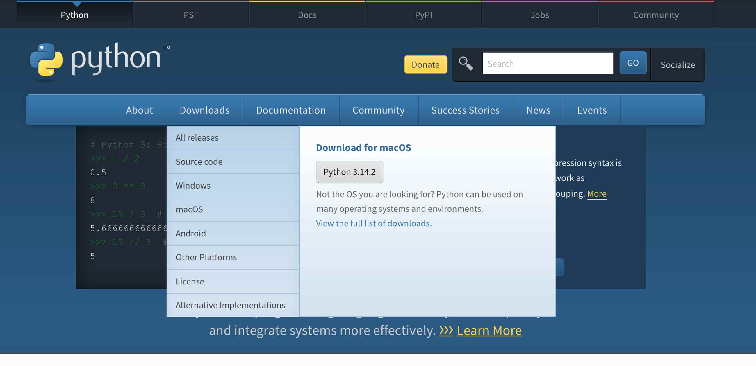 1. Entra a python.org ve al apartado del menú “Downloads” y selecciona “Download for macOS". Es MUY importante que sea la versión para macOS. El instalador es indistinto para arquitecturas x86_64 (Intel) o ARM64 (Apple Silicon).