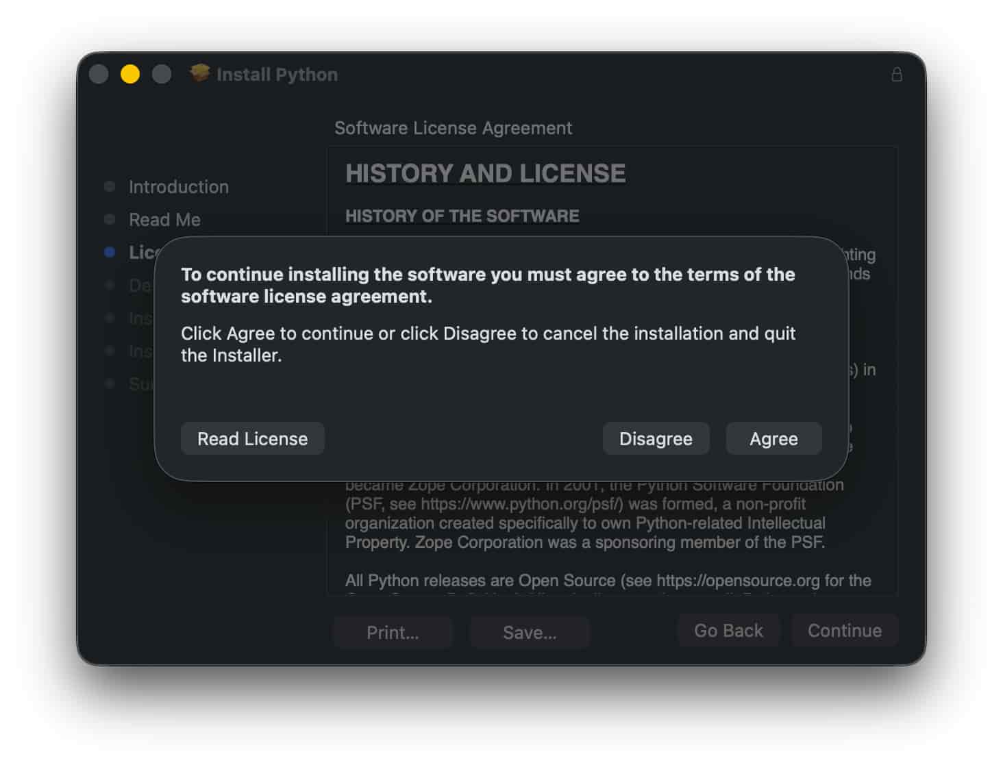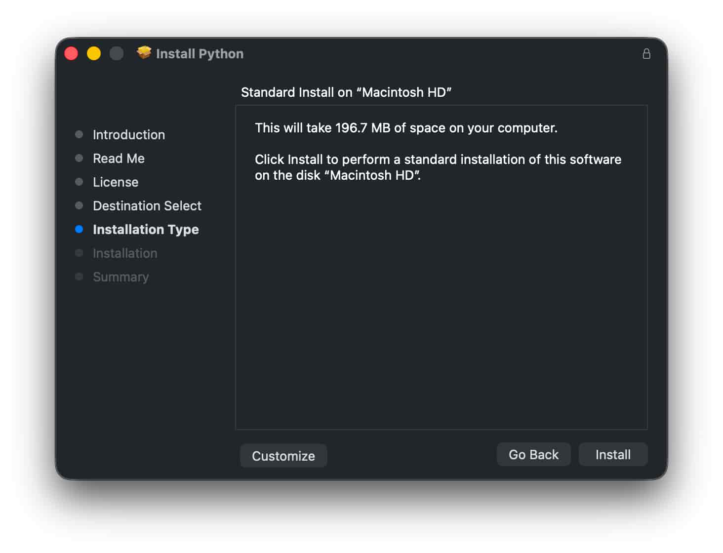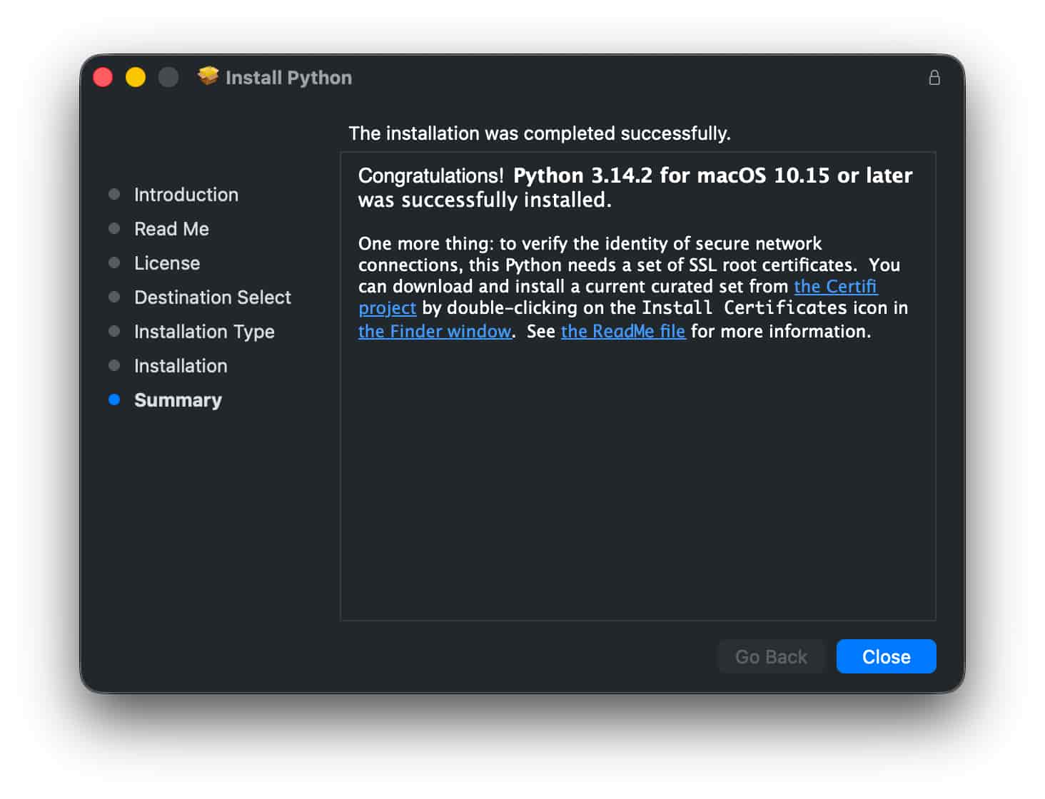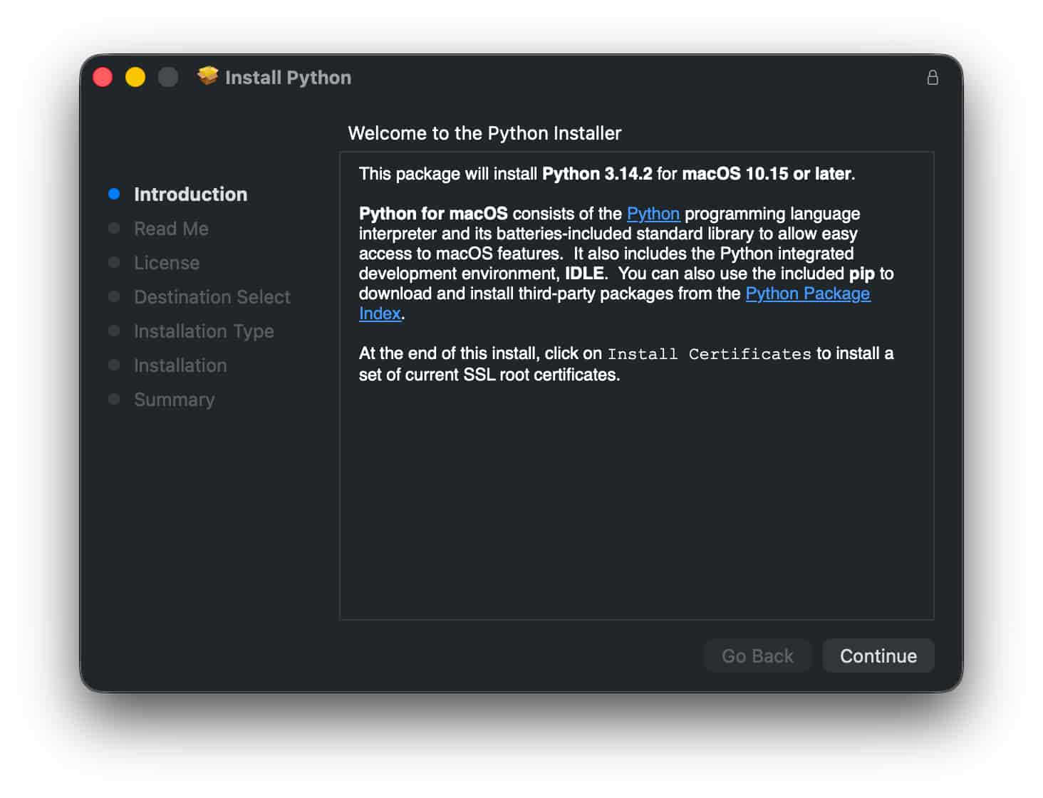 • Si se tiene el manejador de paquetes Homebrew instalado, es posible que el manejador ya haya instalado python en conjunto con alguna otra libería. Sin embargo, no recomiendo utilizar esta versión ya que muy probablemente se instaló una versión específica para un programa en particular. Es decir, no va a ser la más reciente o puede que tenga modificaciones particulares para compatibilidad con el programa