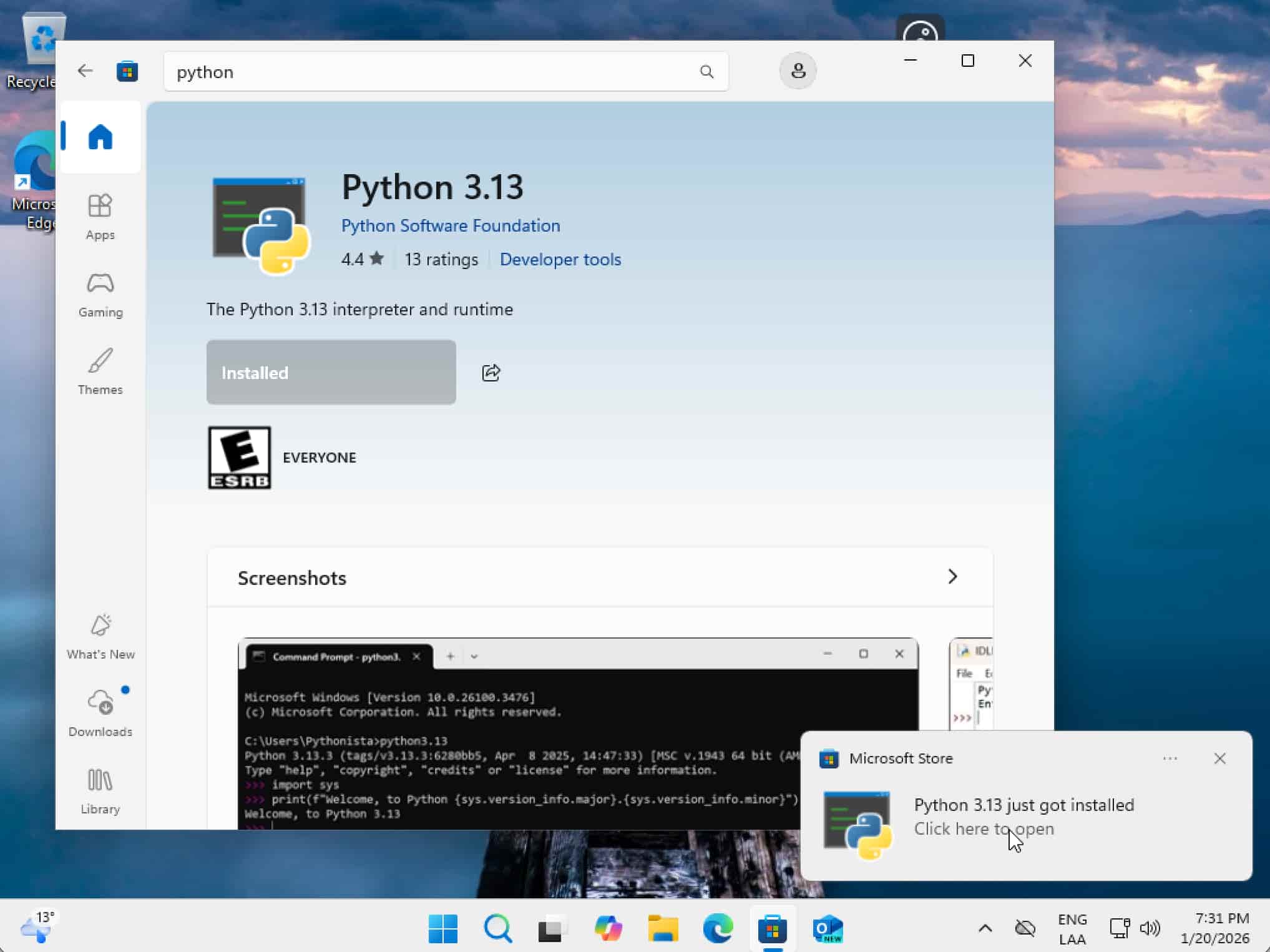 5. Ahora, corroboraremos que python haya sido correctamente instalado en una nueva terminal con el comando: python3 --version. Un ejemplo de respuesta es: “Python 3.14.2”