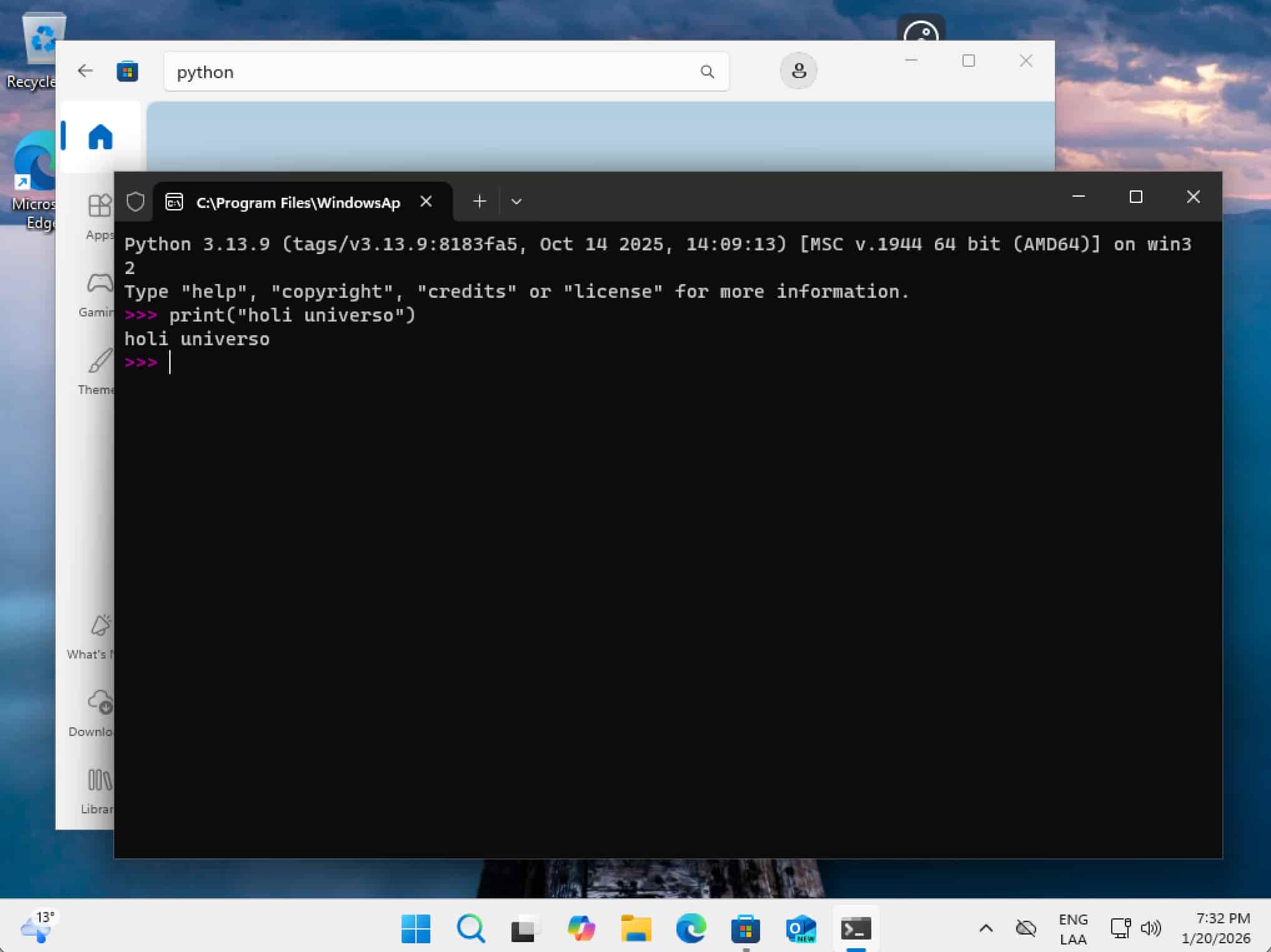 3. Abre una nueva terminal y corre el comando: python para inicializar el lenguaje. Corre una prueba simple, como por ejemplo: print(”holi universo”)